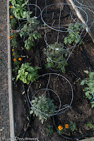 Fruit actually started to appear on some of the tomato plants and on one of the eggplant plants (is that right?) which was a bit of a surprise. You worry about when the plants start producing when they're only been in the ground a week, and these buds almost certainly came with the plant from the store. But it's still nice to see because like you, I am really sick of eating tasteless hot house tomatoes. I had a couple off of our pal Chidi's plants when we were in Tucson last week and while you think those red things in your February Caprise are tomatoes, I assure you that they are not. One taste of a home grown makes you long for July and August..